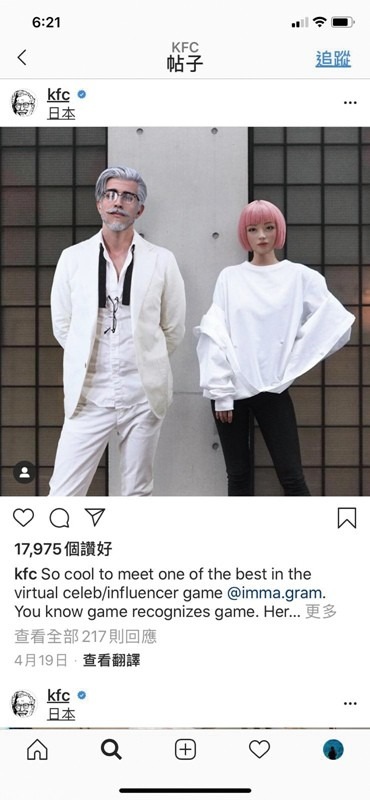肯德基虛擬代言人年輕版上校與日本虛擬模特兒Imma 合影照片,成為熱話。