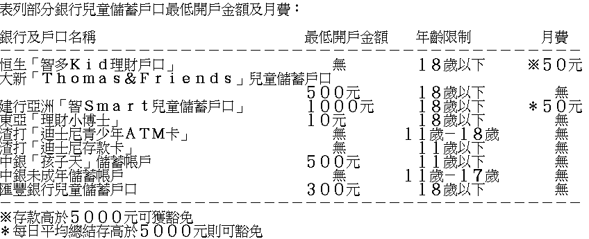 開設兒童儲蓄戶口 須注意收費項目