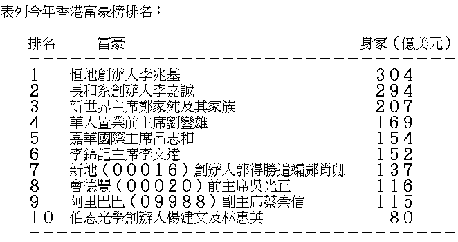香港富豪榜排名大洗牌!《福布斯》公布今年香港富豪榜,已盤踞香港首富之位多年的長和系創辦人李嘉誠首次讓位,而去年退任恆基地產(00012)主席一職的李兆基,則以304億美元登上今年首富寶座。