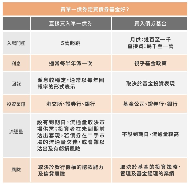 古語有云,切勿孤注一擲。投資單一債券或債券基金互有長短,債券基金除入場門檻較低,由於如同買入多隻債券,可以大大分散債券違約風險。不過,李紹權提醒,投資基金涉及管理費、表現費等額外成本,但多數收費是大同小異,反而投資者更需注意基金投資哪類債券、投資目標及策略,以及基金經理的業績表現作比較。