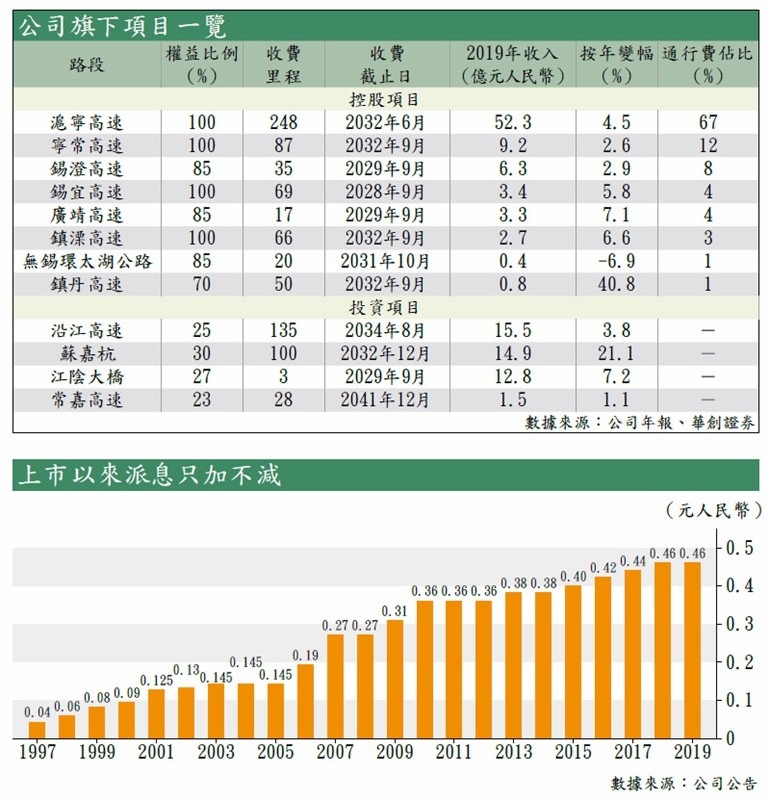 華創證券回顧集團的歷史,認為其再投資能力強,於2004年至2006年以105億元投資,對滬寧高速進行4改8擴建的效果顯著,2007年的車流較2003年猛增56%,收入及毛利更翻倍,2007年至2010年的總毛利已達112億元,超過當初的投資。該行指,集團2015年完成寧常、錫宜等路段收購,表現同樣優秀,其中前者已成為集團第二大收入路段。